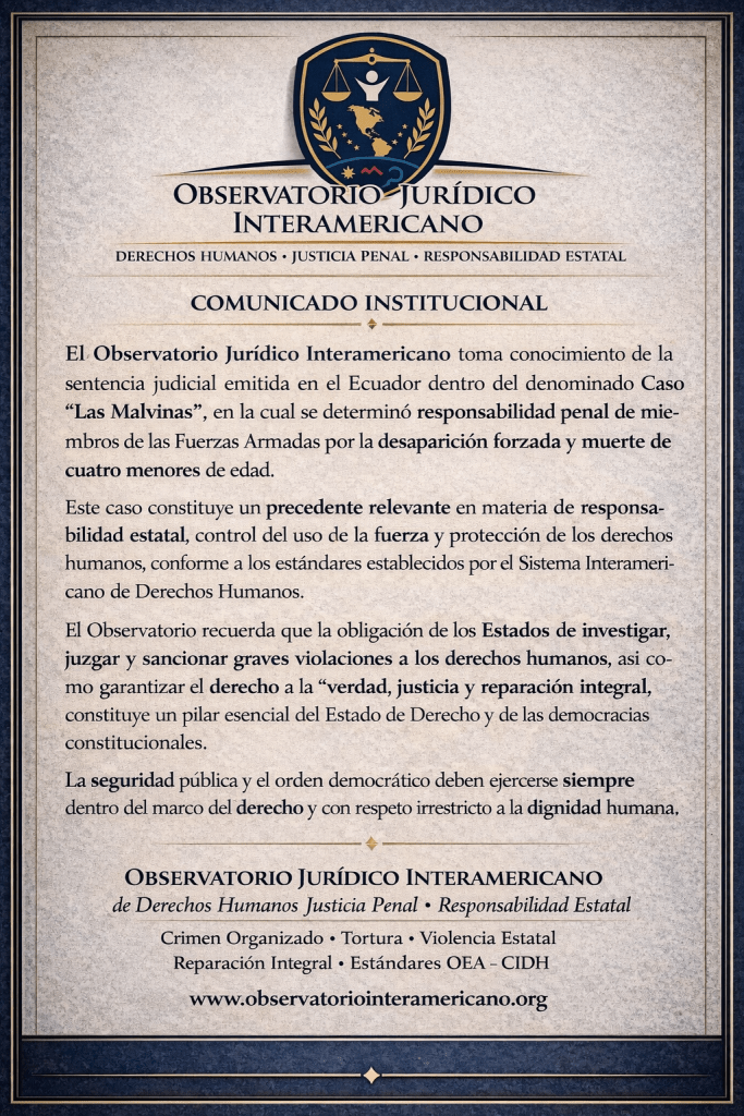 El Observatorio Jurídico Interamericano de Derechos Humanos, Justicia Penal y Responsabilidad Estatal expresa su profunda preocupación y reflexión institucional frente a la sentencia judicial emitida en el Ecuador en relación con el denominado Caso “Las Malvinas”, en el cual se determinó responsabilidad penal de miembros de las Fuerzas Armadas por la desaparición forzada y muerte de cuatro menores de edad.
